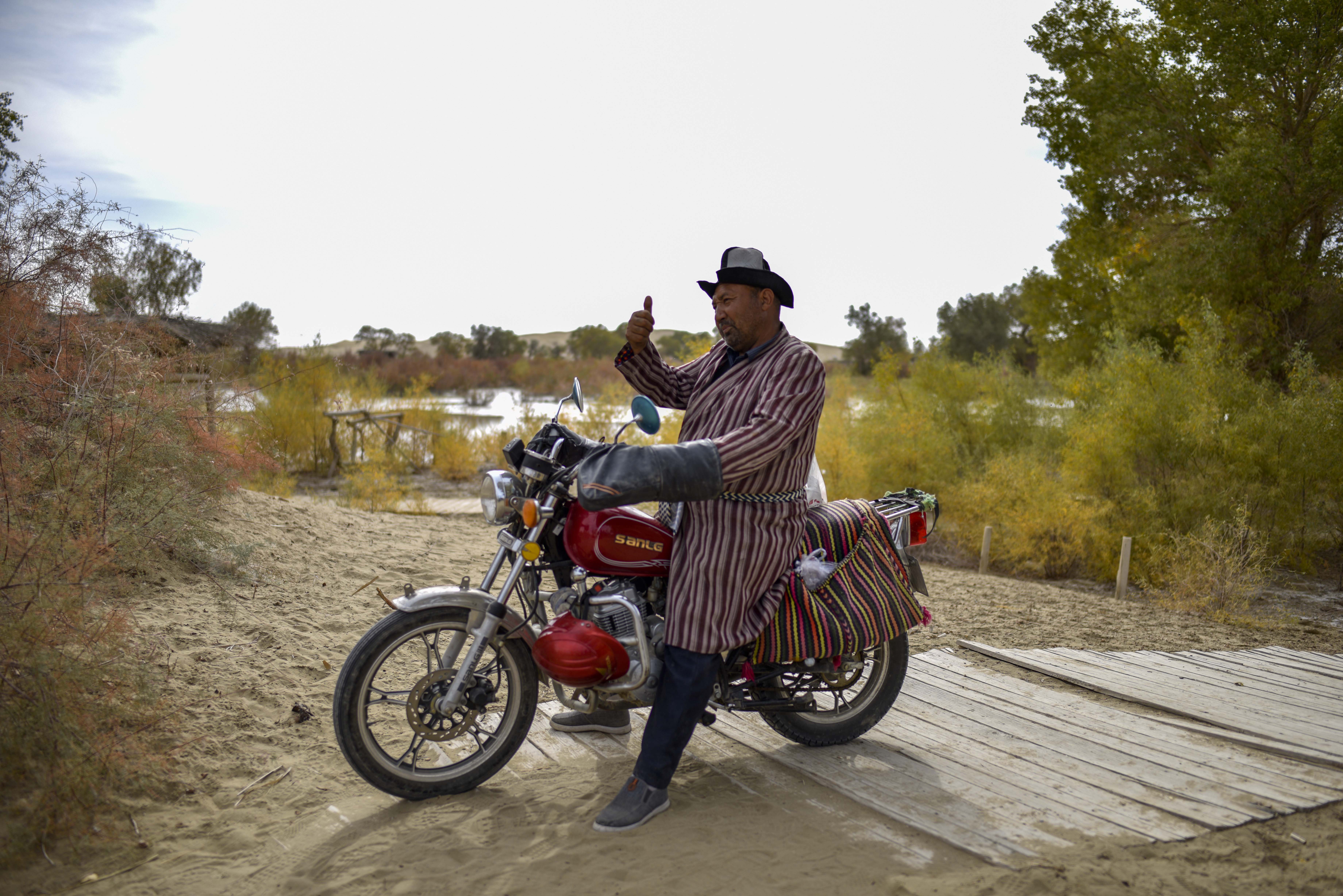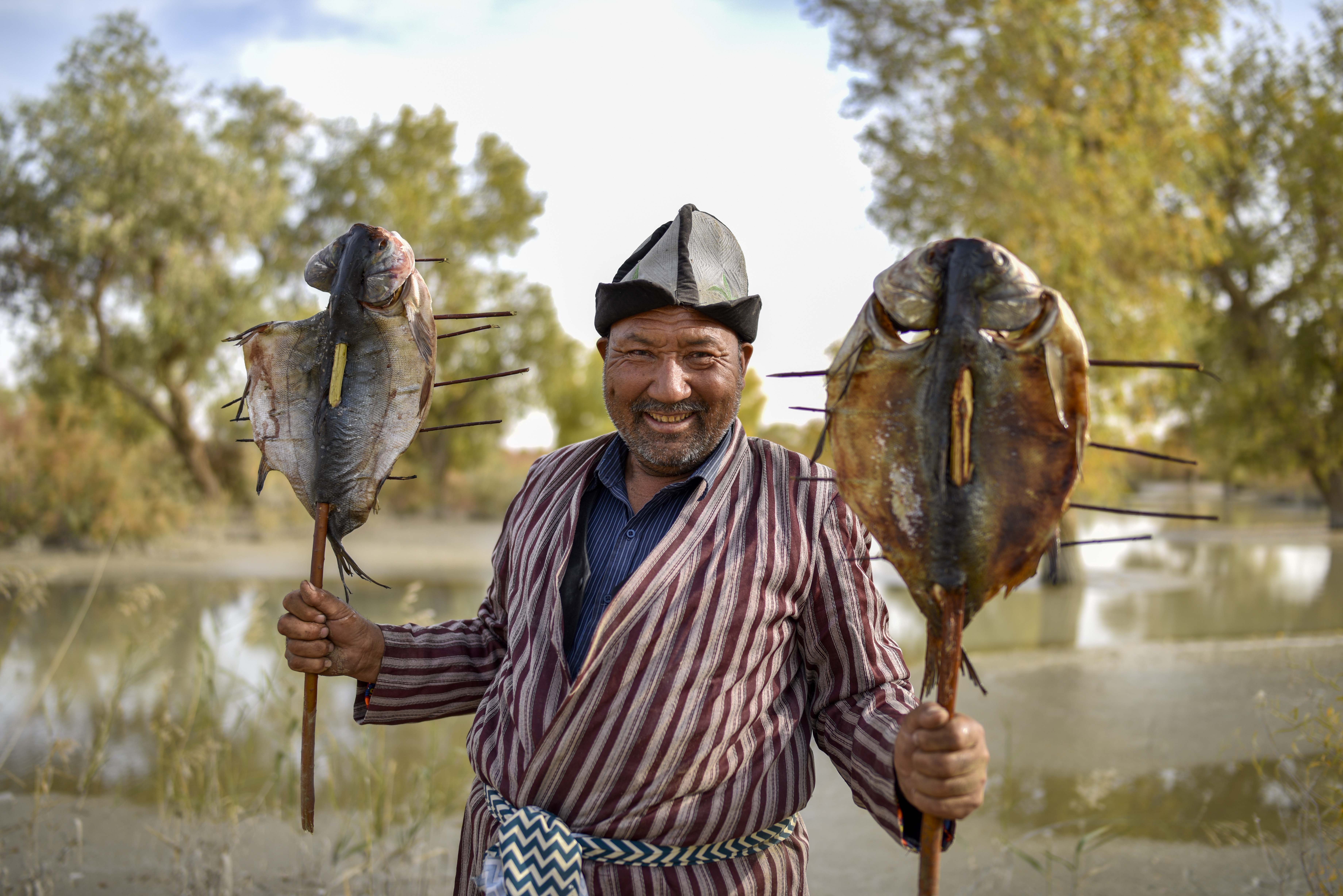 Amudun Abudu, a 61-year old typical Lop Nur villager, works in local tourism industry. With the changes of the times, many Lop Nur people have various options for a living, yet he insists on the tradition of fishing in rivers and lakes. Not only does he make delicious roast fish, Amudun also makes canoe models and pen holders made of populus euphratica trees for tourists during the tourist rush season.