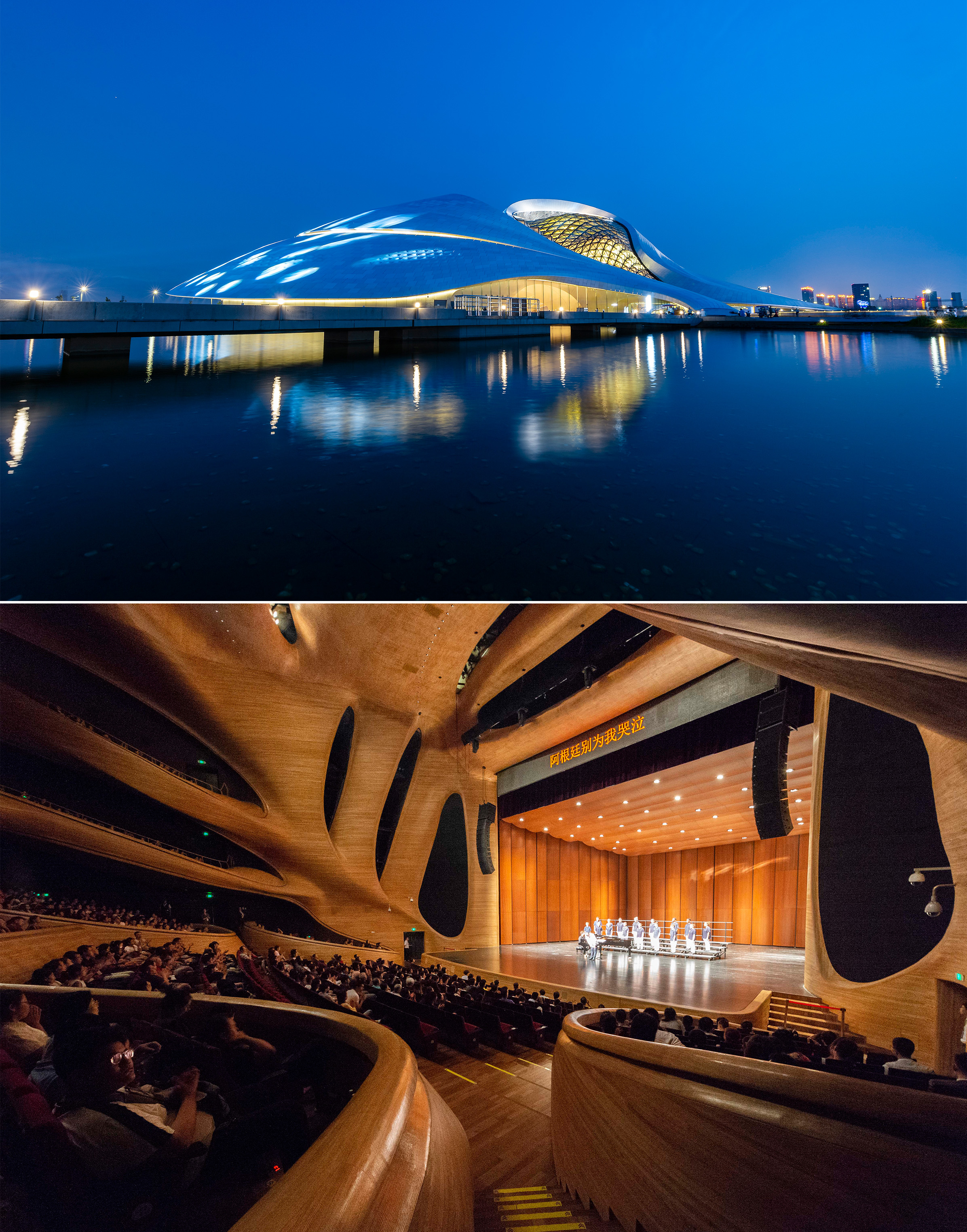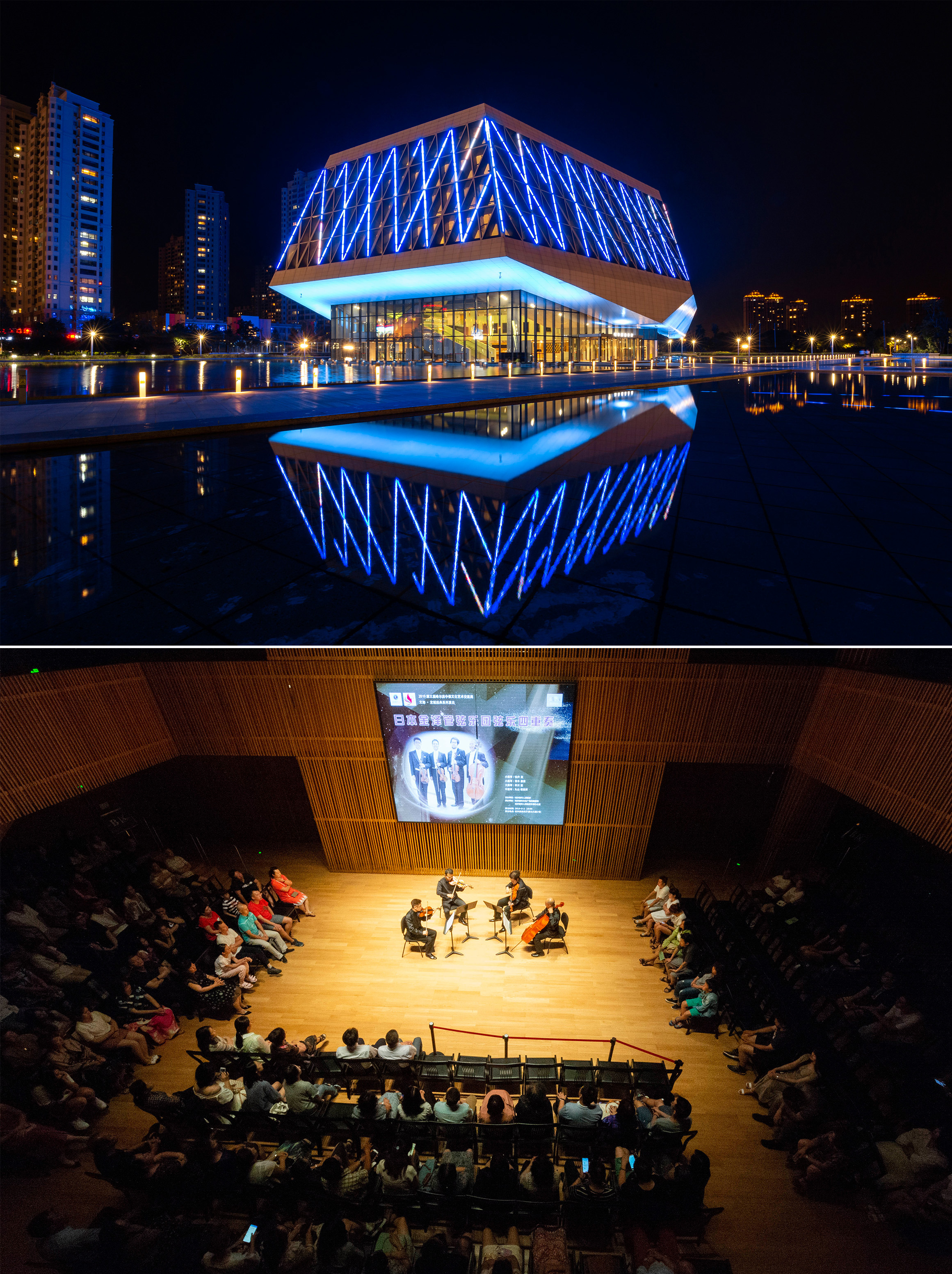 Combo photo taken on Aug. 2 2019 shows the exterior of Harbin Symphony Orchestra(up) and performance inside the hall (down)in Harbin, capital of northeast China's Heilongjiang Province. (Xinhua/Xie Jianfei)