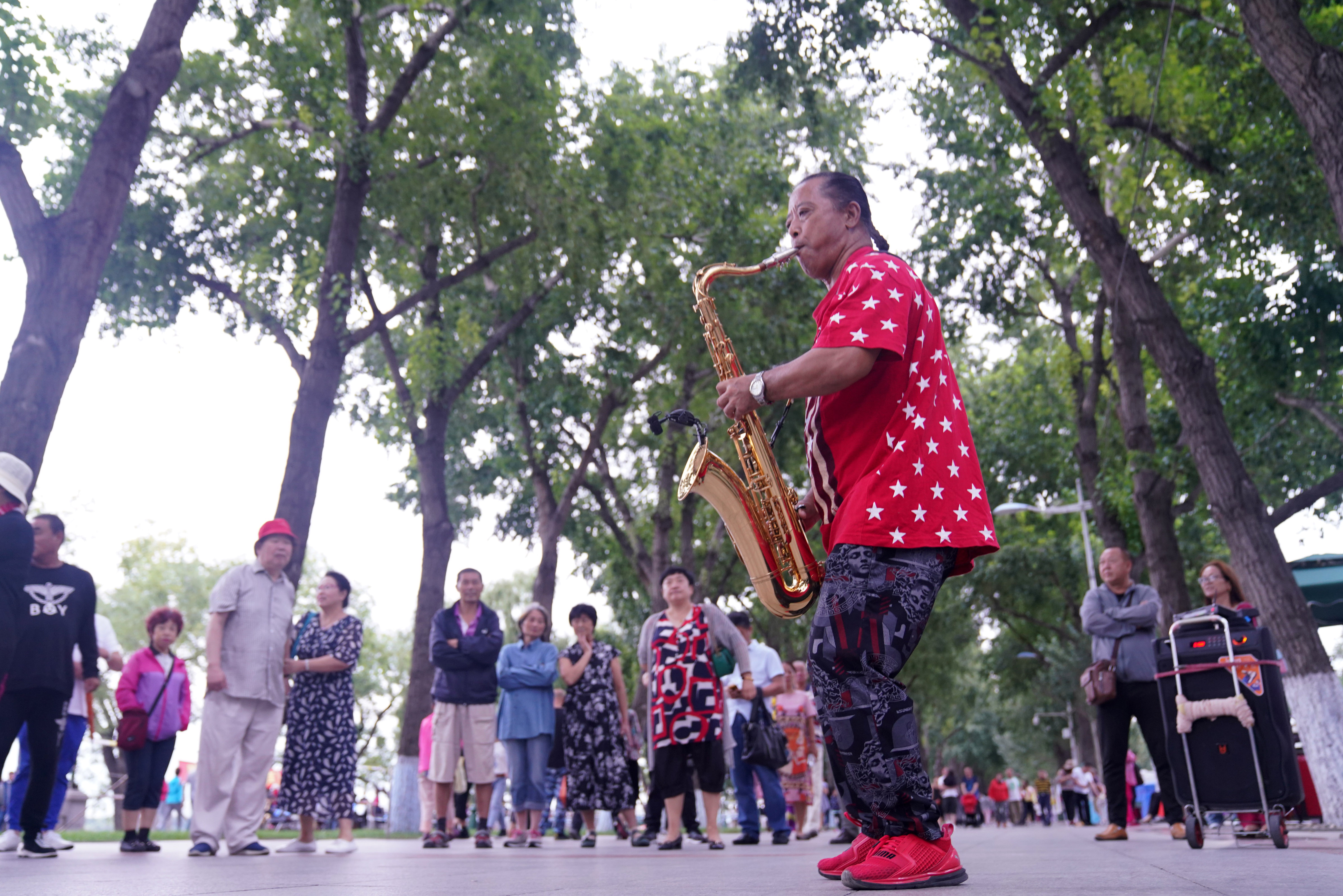 A citizen plays a saxophone in a park in Harbin, capital of northeast China's Heilongjiang Province, Aug. 9, 2019. (Xinhua/Wang Jianwei)