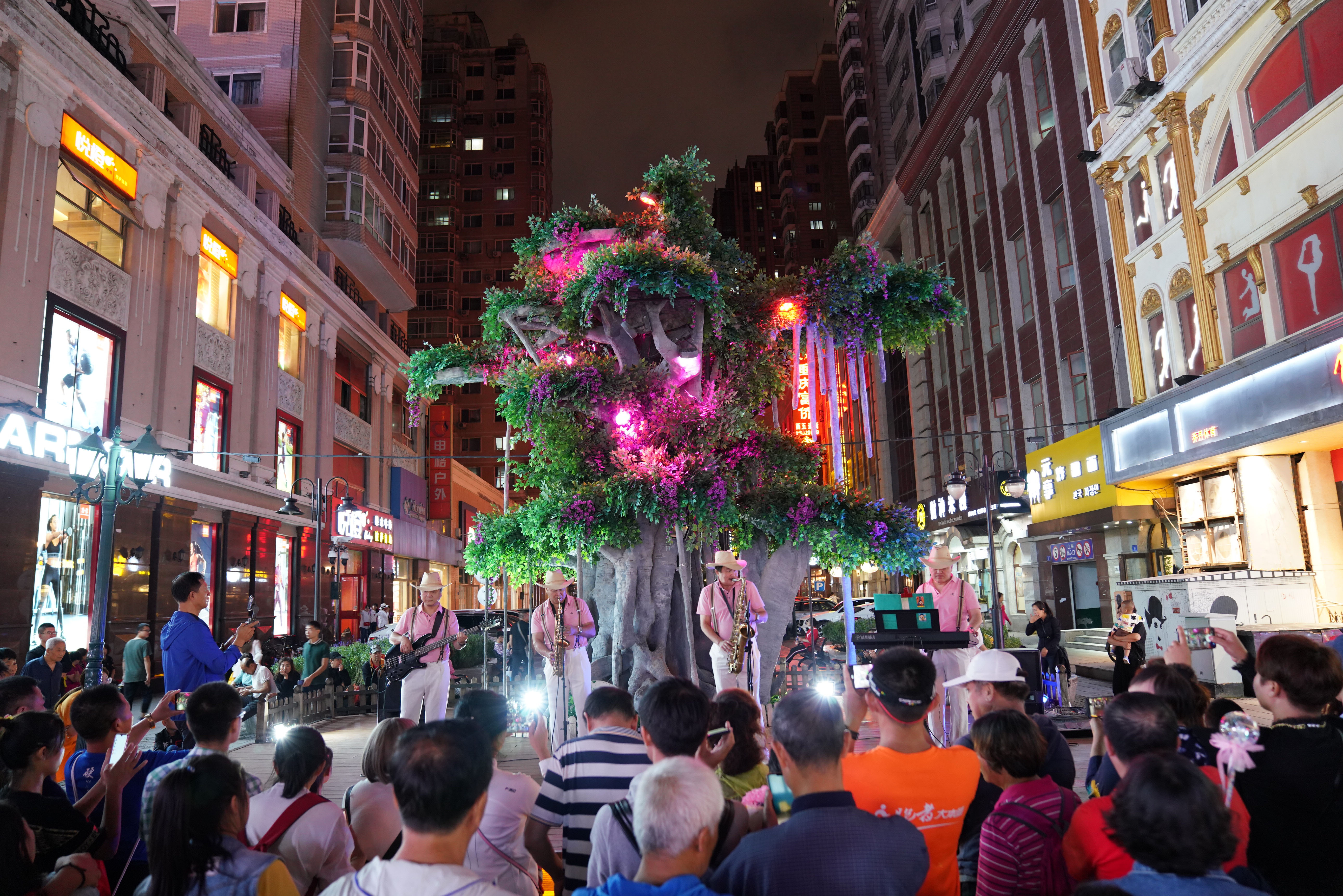 People enjoy performance on the Central Avenue in Harbin, capital of northeast China's Heilongjiang Province, Aug. 24, 2019. (Xinhua/Wang Jianwei)