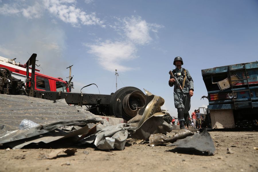 A soldier searches the site of a bomb attack in Kabul, capital of Afghanistan, Sept. 3, 2019. (Xinhua/Rahmatullah Alizadah)