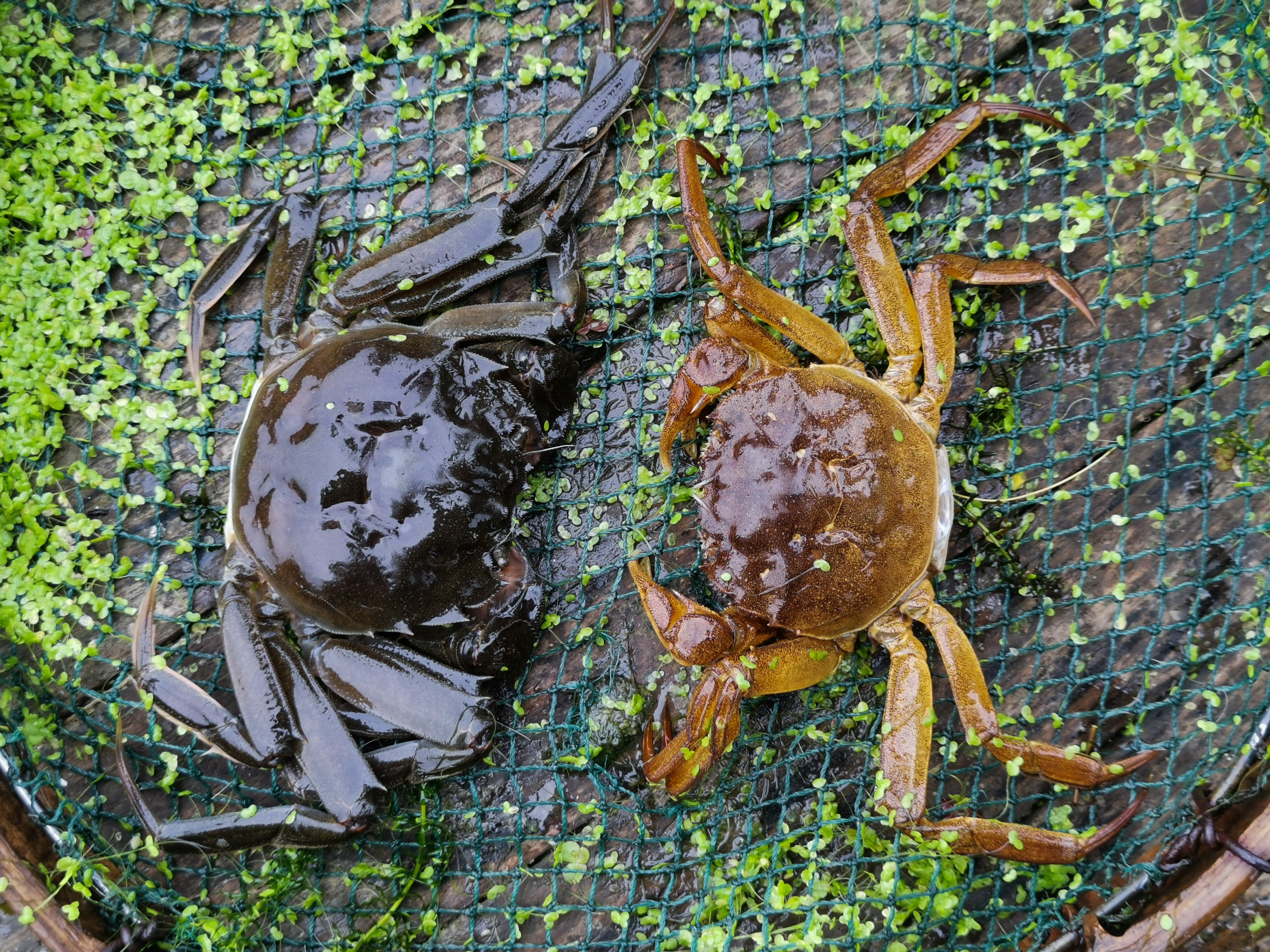 Photo taken on Sept. 4, 2019 shows a crab (L) and its shell at an aquaculture cooperative in Zhili Township of Huzhou, east China's Zhejiang Province.