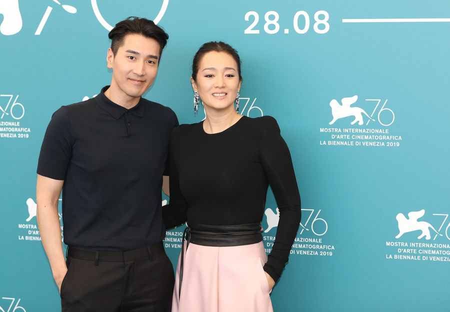 Chinese actor Mark Chao (L) and actress Gong Li attend a photocall for the film "Saturday Fiction" at the 76th Venice Film Festival in Venice, Italy, Sept. 4, 2019. (Xinhua/Cheng Tingting)