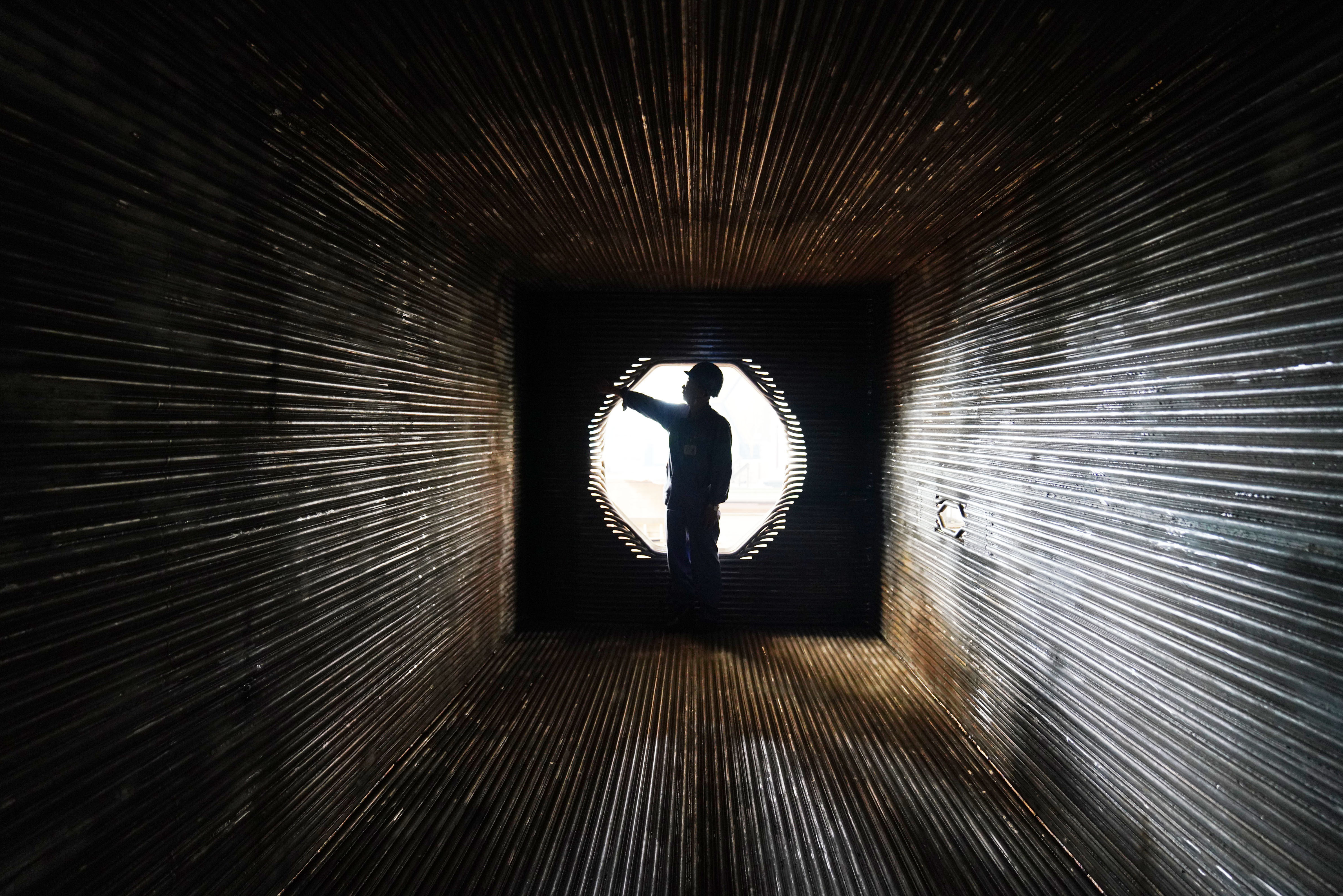 A worker is seen at a boiler production factory of Harbin Boiler Company Limited in Harbin, Sept. 4, 2019. (Xinhua/Wang Jianwei)