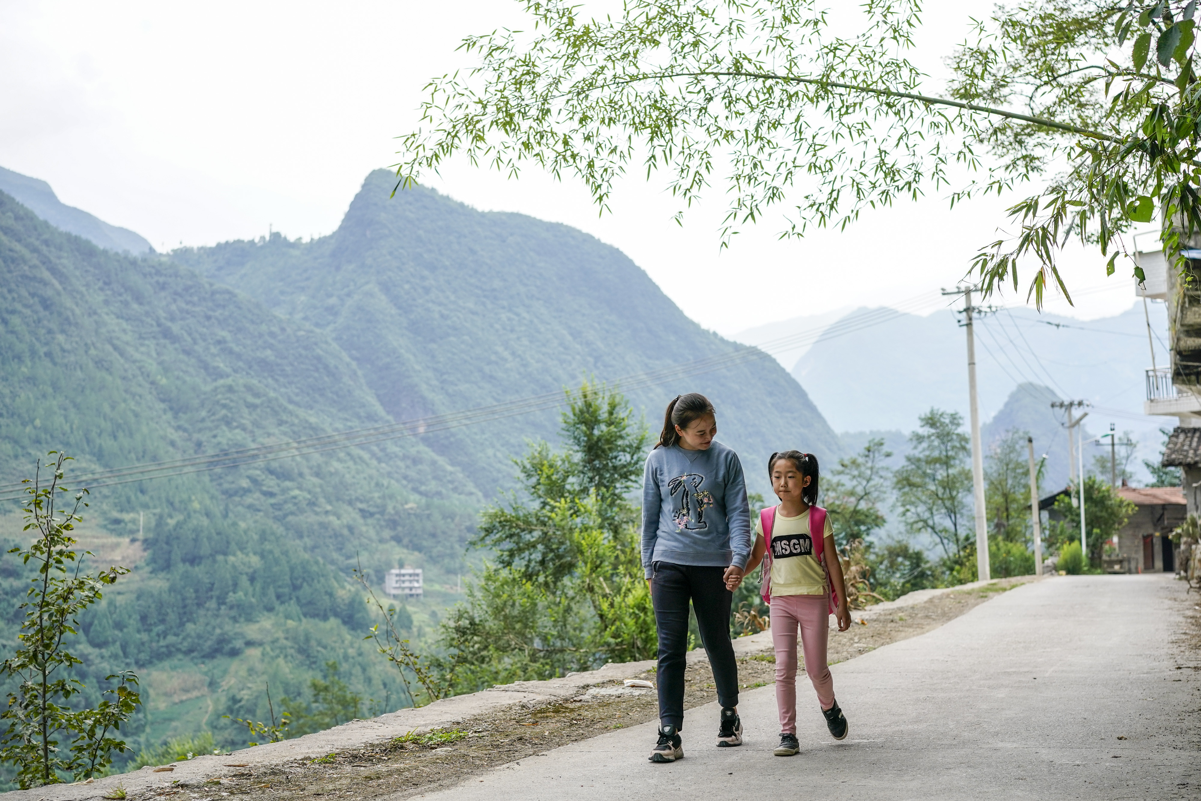 Mu Yi walks with a girl after school at Luzi Village, Chengkou County, SW China's Chongqing Municipality. (Xinhua/Liu Chan)