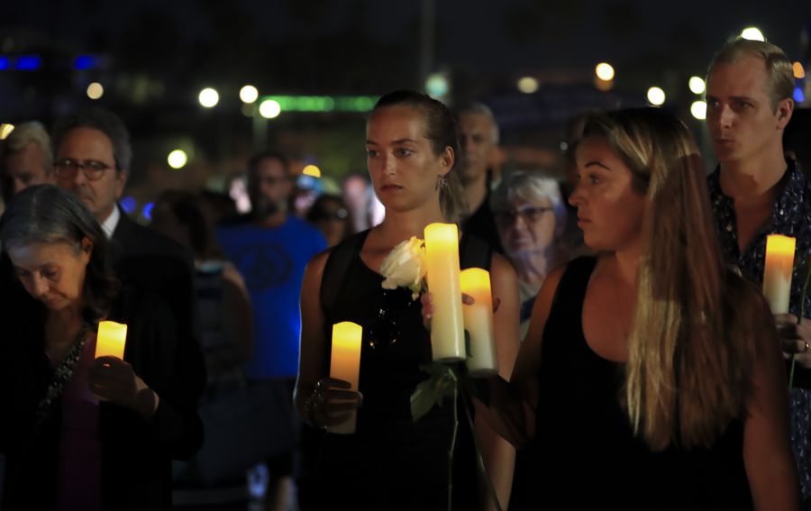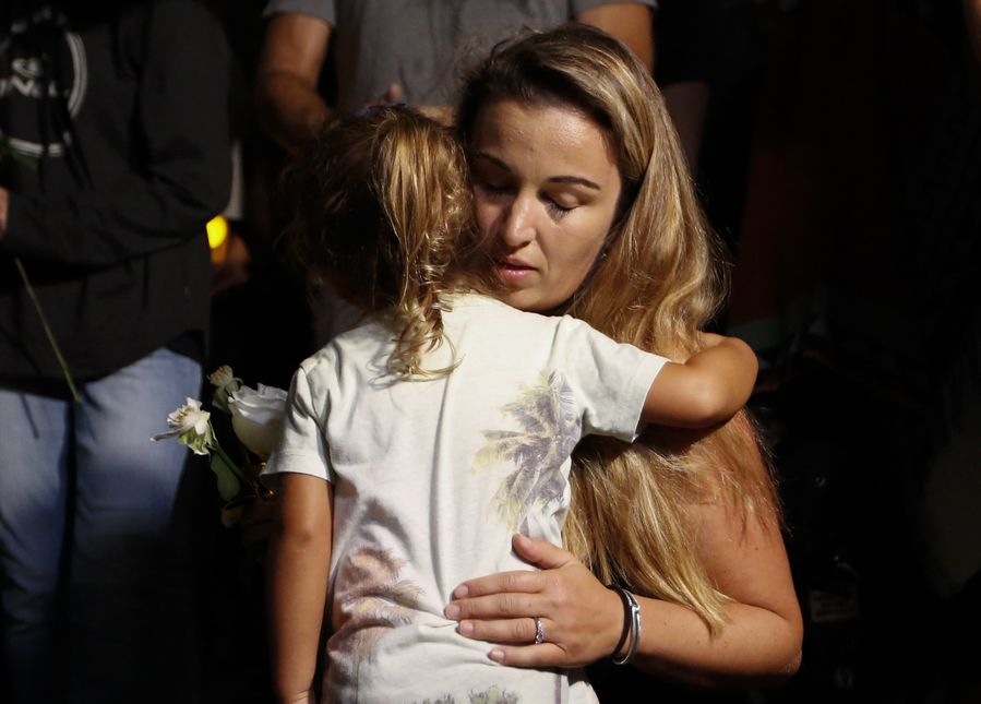 Mourners wept, embraced and placed white flowers in baskets at Santa Barbara's Chase Palm Park.