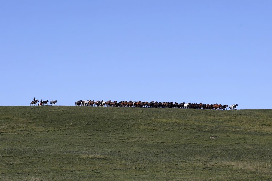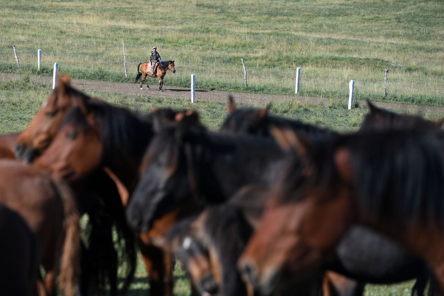 Photo taken on Sept. 10, 2019 shows a herdsman and his horses at Shandan horse ranch in Shandan County of Zhangye City, northwest China's Gansu Province.(Xinhua/Ma Ning)