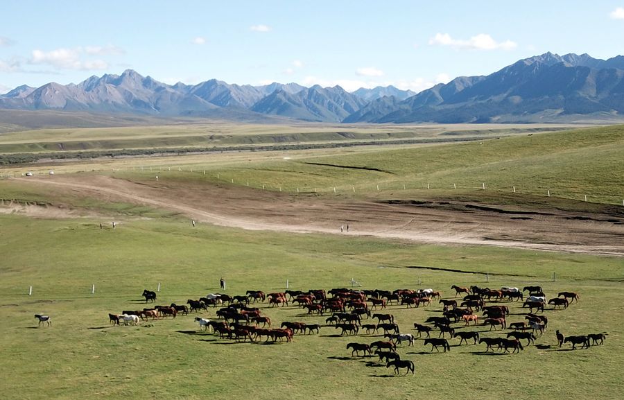 Aerial photo taken on Sept. 10, 2019 shows a herd of horses at Shandan horse ranch in Shandan County of Zhangye City, northwest China's Gansu Province. (Xinhua/Ma Ning)