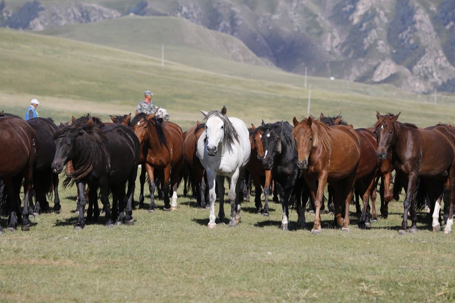 Photo taken on Sept. 10, 2019 shows herdsmen and horses at Shandan horse ranch in Shandan County of Zhangye City, northwest China's Gansu Province. (Photo by Du Zheyu/Xinhua)