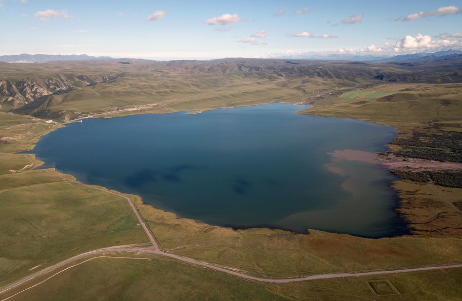 Aerial photo taken on Sept. 10, 2019 shows an early autumn scenery of the Luanniao Lake at the Shandan horse ranch in Shandan County of Zhangye City, northwest China's Gansu Province.(Xinhua/Ma Ning)