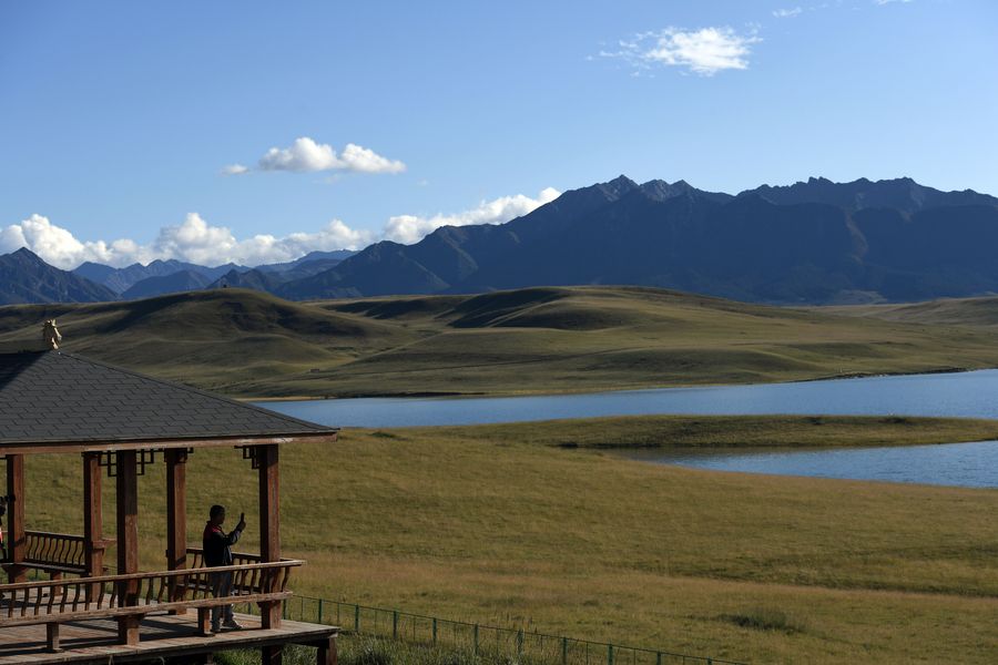 A visitor takes photos by the Luanniao Lake at Shandan horse ranch in Shandan County of Zhangye City, northwest China's Gansu Province, Sept. 10, 2019.(Xinhua/Ma Ning)