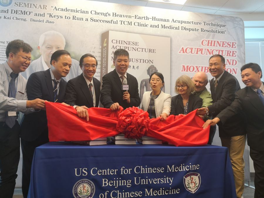 Acupuncture experts unveil the fourth English edition of "Chinese Acupuncture and Moxibustion" in Maryland, the United States, on Sept. 14, 2019. (Xinhua/Zhou Zhou)