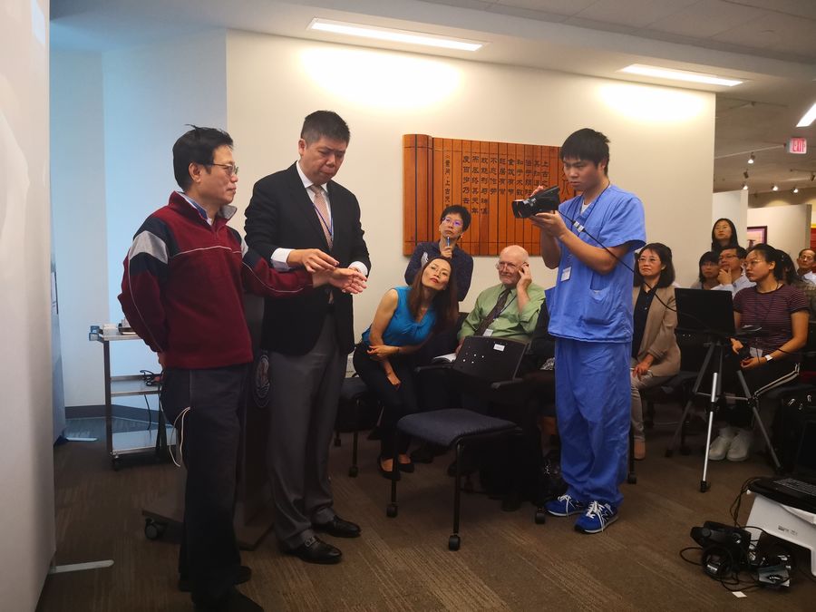 At the U.S. Center for Chinese Medicine in Maryland, Cheng demonstrated how to stick the needle tips into the proper depths to solve shoulder and back problems, and how to use a Virtual Reality system to improve acupuncture teachings.