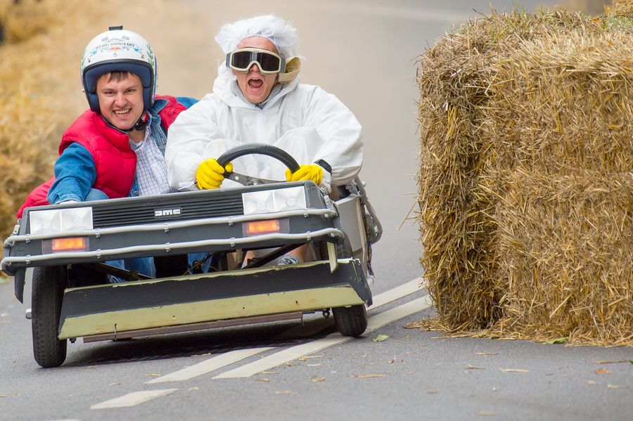 Competitors are racing in various soapbox cars which are handmade, non-motorized vehicles powered by gravity and kinetic energy.