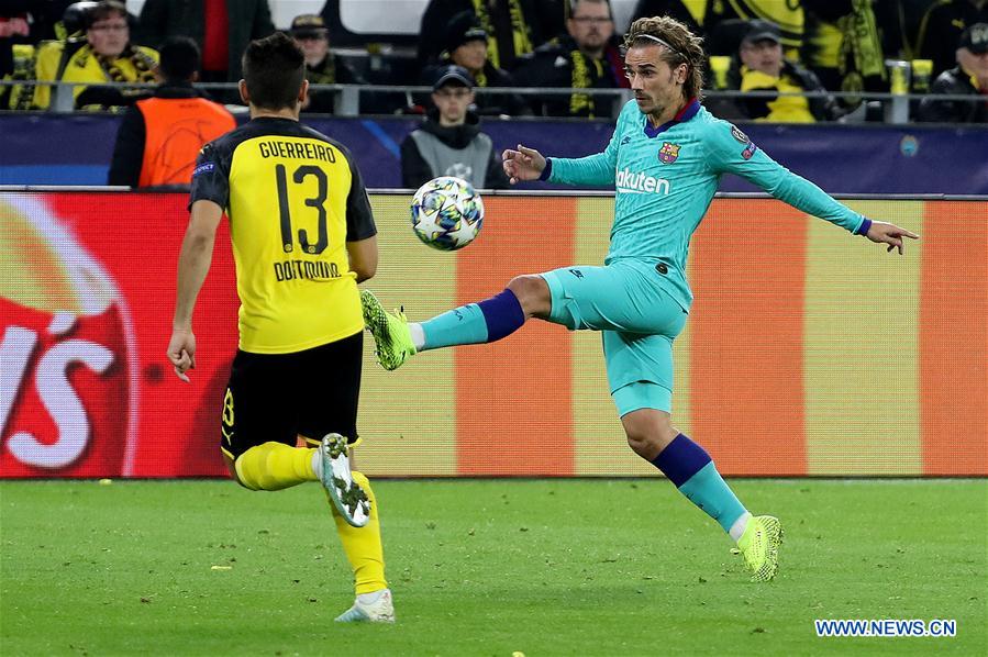 Antoine Griezmann (R) of Barcelona vies with Raphael Guerreiro of Dortmund during the UEFA Champions league group F soccer match between Borussia Dortmund and FC Barcelona in Dortmund, Germany, Sept. 17, 2019. (Photo by Joachim Bywaletz/Xinhua)