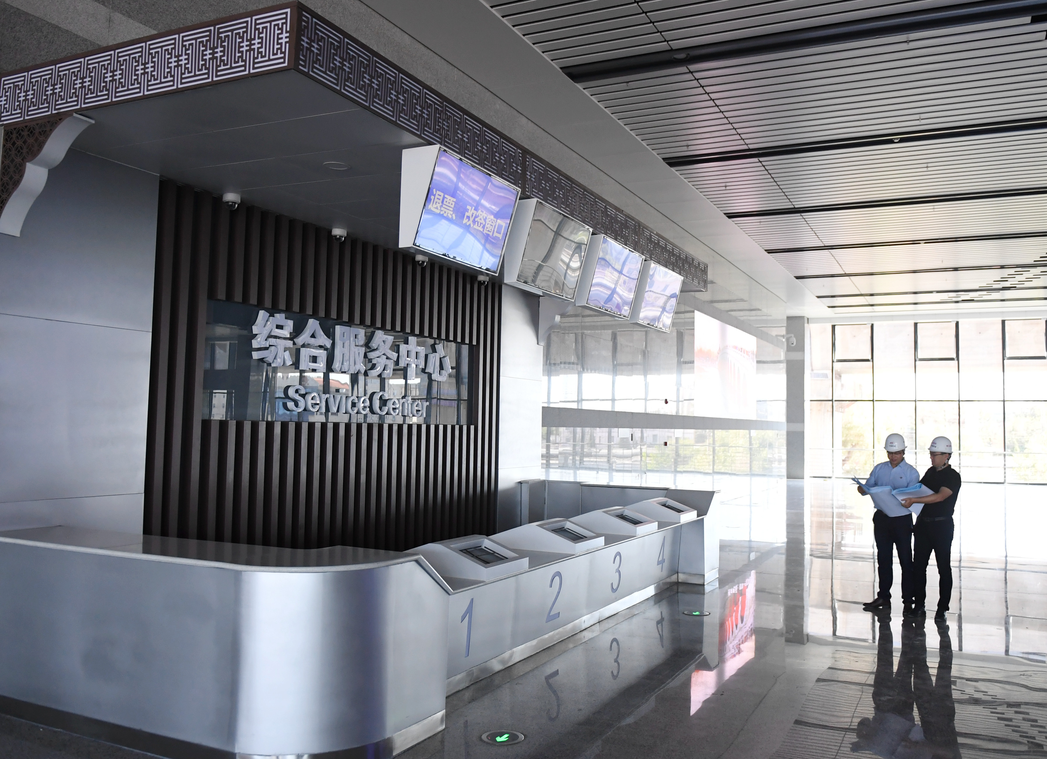 Staff members check the service center at the Daxing station on the intercity railway linking Beijing with Xiongan New Area in Beijing, capital of China, Sept. 18, 2019. (Xinhua/Zhang Chenlin)
