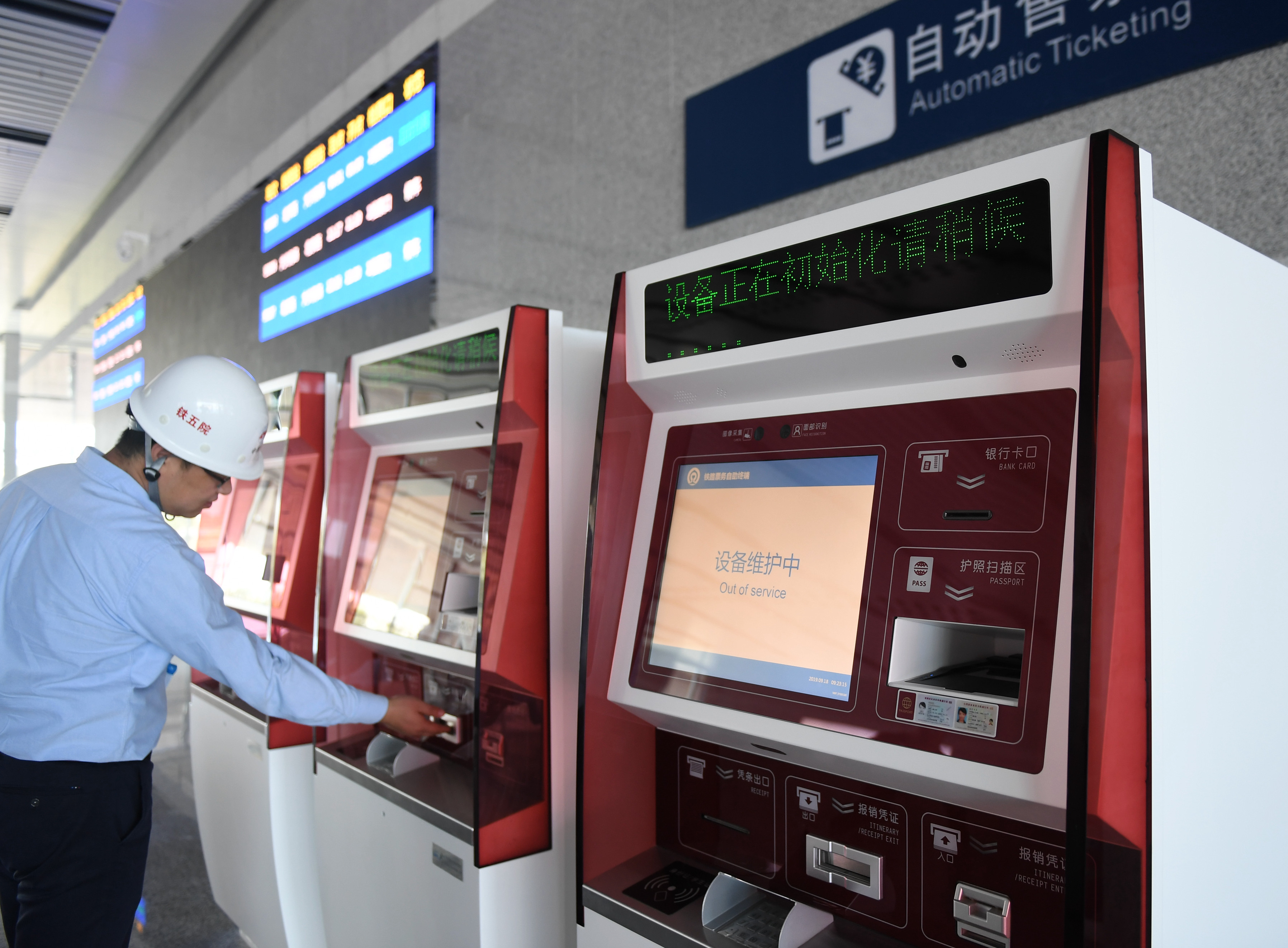 A staff member checks the automatic ticket selling machine at the Daxing station on the intercity railway linking Beijing with Xiongan New Area in Beijing, capital of China, Sept. 18, 2019. (Xinhua/Zhang Chenlin)