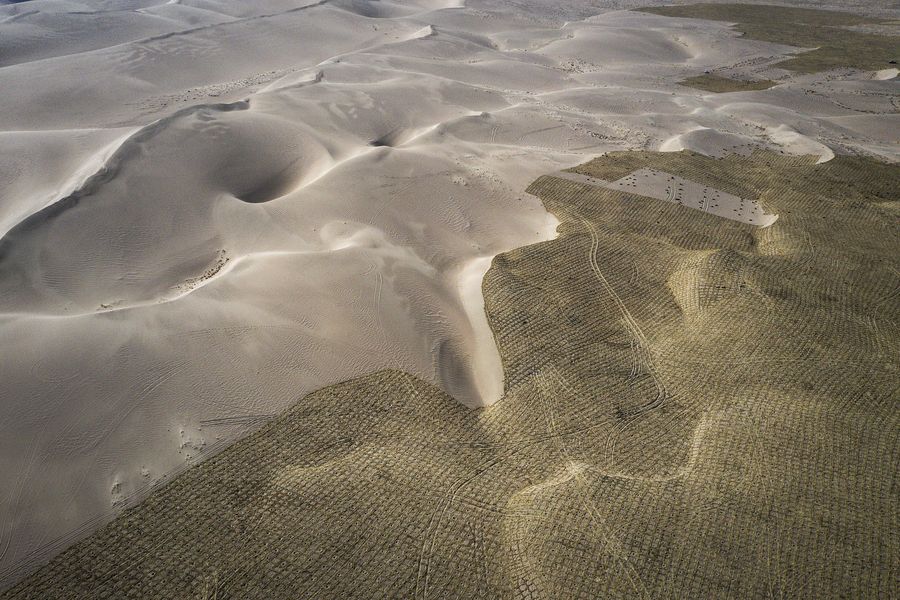 File photo taken on March 28, 2019 shows sand barriers under the Ant Forest initiative in the Tengger Desert, northwest China's Gansu Province. (Ant Forest/Handout via Xinhua)