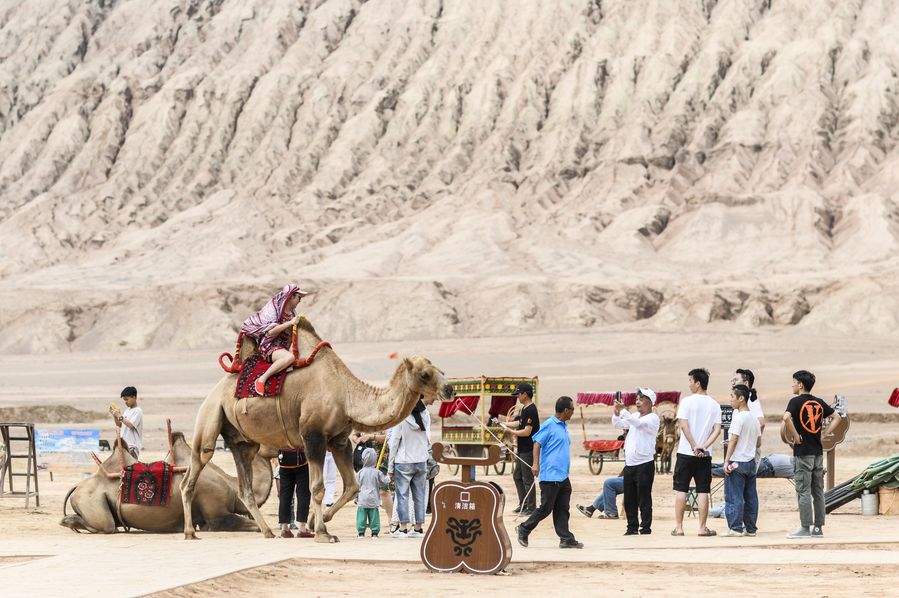 People visit the Flaming Mountains scenic spot in Turpan, northwest China's Xinjiang Uygur Autonomous Region, July 15, 2019. (Xinhua/Zhao Ge)