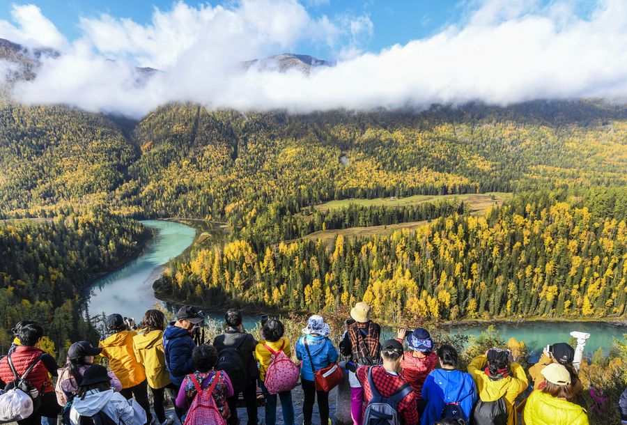 Tourists enjoy the scenery at Kanas scenic spot in Altay, northwest China's Xinjiang Uygur Autonomous Region, Sept. 25, 2019. (Xinhua/Wang Fei)