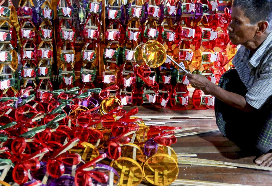 A man paints toy lanterns at a workshop in Yangon, Myanmar, Oct. 3, 2019. (Photo by U Aung/Xinhua)