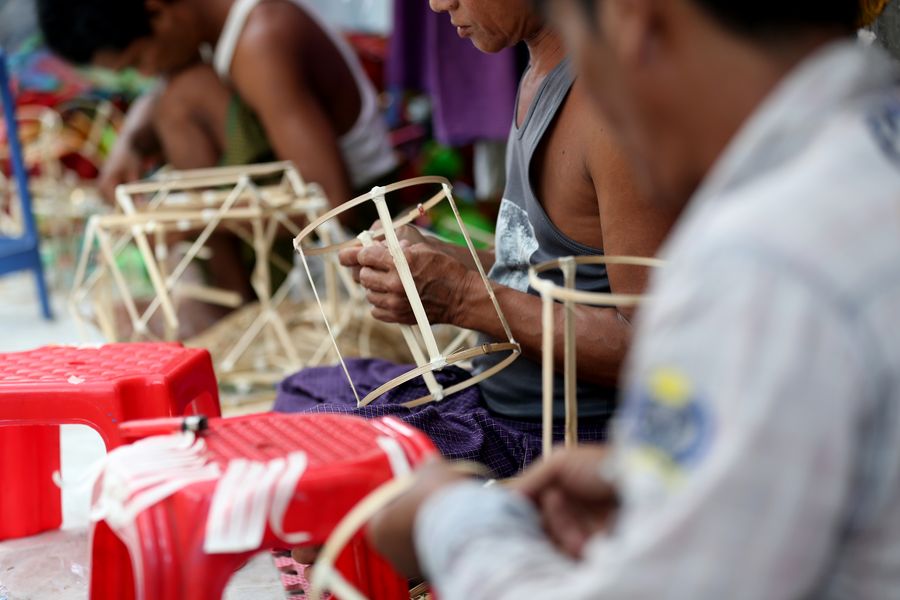 Workers curve lantern shapes at a workshop in Yangon, Myanmar, Oct. 4, 2019. (Photo by U Aung/Xinhua)