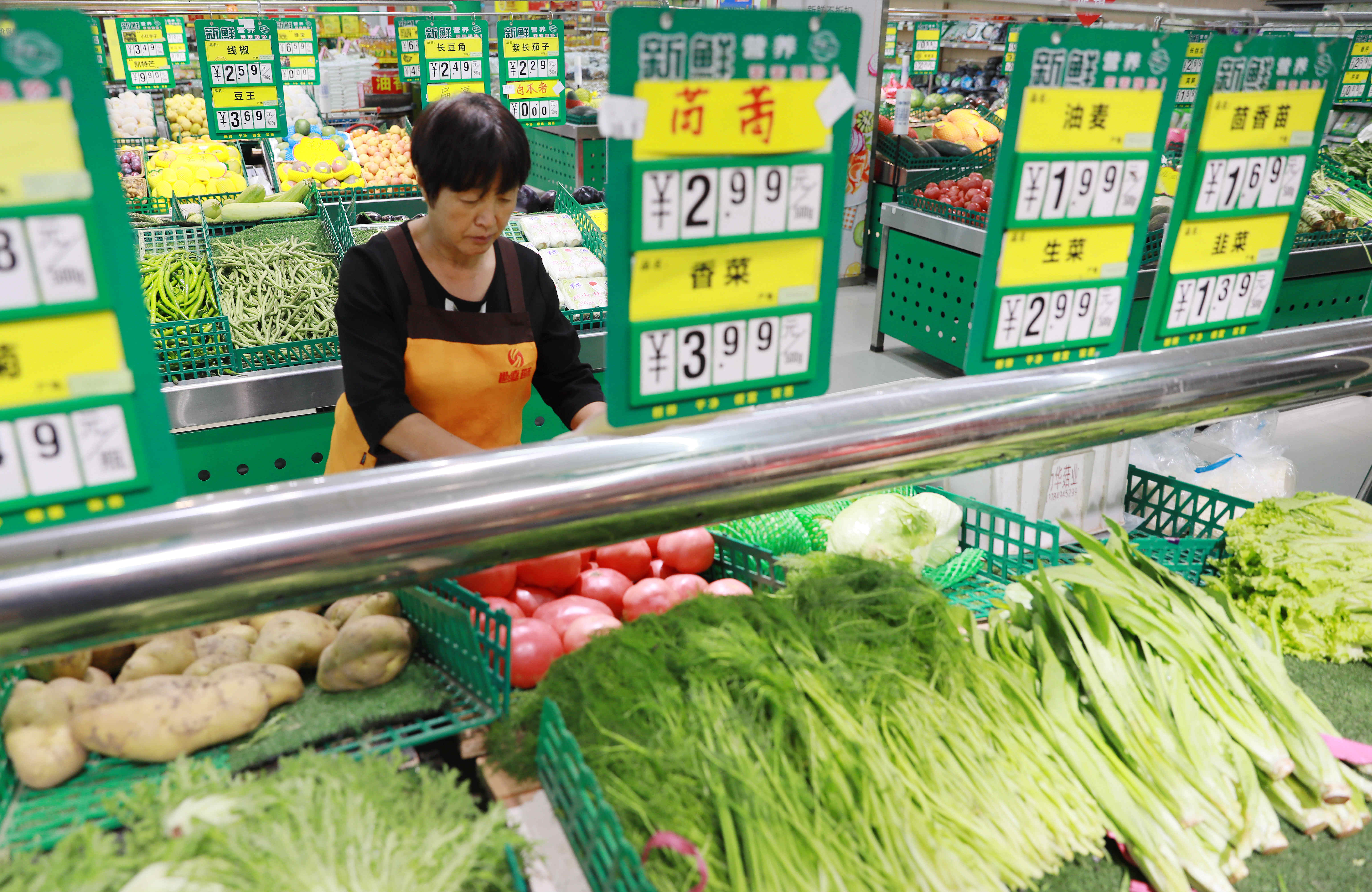 A staff member places vegetables at a supermarket in Xingtai, north China's Hebei Province, Oct. 15, 2019. (Xinhua/Song Jie)