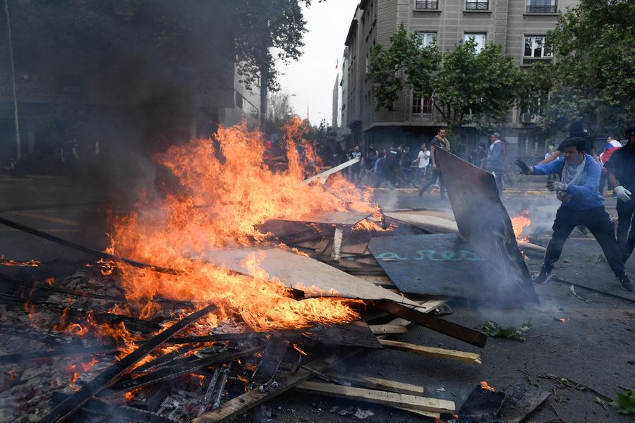 Protestors create a barricade during a demonstration against the rise in public transport prices, in Santiago, capital of Chile, on October 19, 2019. (Xinhua/Jorge Villegas)