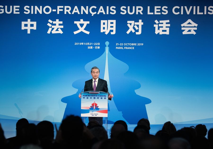 Chinese State Councilor and Foreign Minister Wang Yi gives a speech while attending the opening ceremony of the Sino-French Dialogue of Civilization in Paris, France, Oct. 21, 2019. (Photo by Jack Chan/Xinhua)