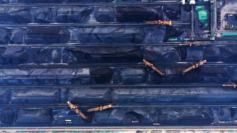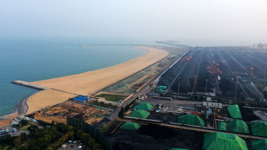 Aerial photo taken on Oct. 23, 2019 shows staff members cleaning and transporting coal to designated area at Shijiu Port Area of Rizhao Port in Rizhao City, east China's Shandong Province, Oct. 23, 2019. (Xinhua/Wang Kai)