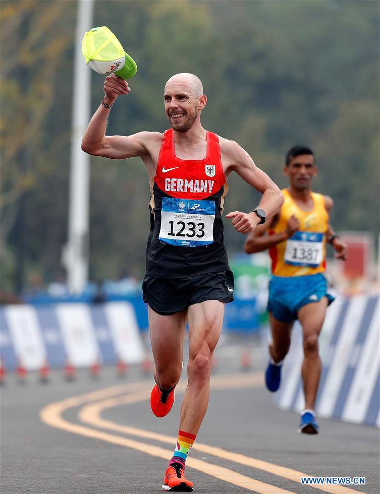 Steffen Justus of Germany greets the spectators during the men's marathon individual final of track and field at the 7th CISM Military World Games in Wuhan, capital of central China's Hubei Province, Oct. 27, 2019. (Xinhua/Wang Lili)
