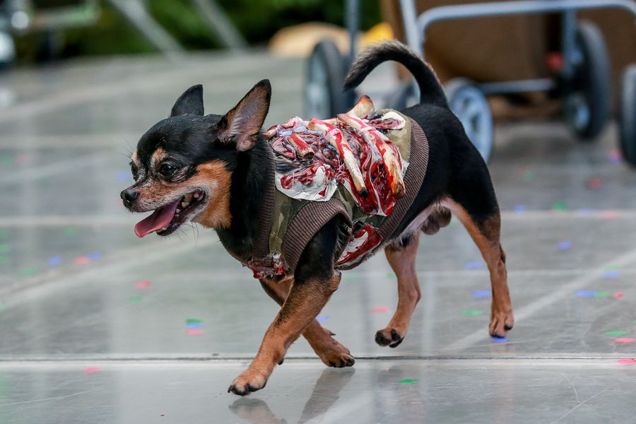 A dog dressed in Halloween costume is seen during the "Petrified" Halloween celebration in Quezon City, the Philippines, Oct. 27, 2019. (Xinhua/Rouelle Umali)
