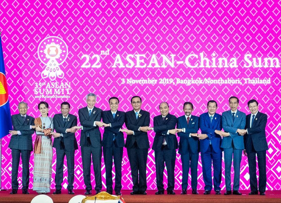 Chinese Premier Li Keqiang (5th L) poses for a group photo with other leaders at the 22nd China-ASEAN (10+1) leaders' meeting in Bangkok, Thailand, Nov. 3, 2019. (Xinhua/Zhai Jianlan)