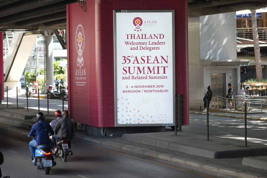 People pass by a poster of the 35th ASEAN summit and related summits in Bangkok, Thailand, Oct. 30, 2019. (Xinhua/Rachen Sageamsak)