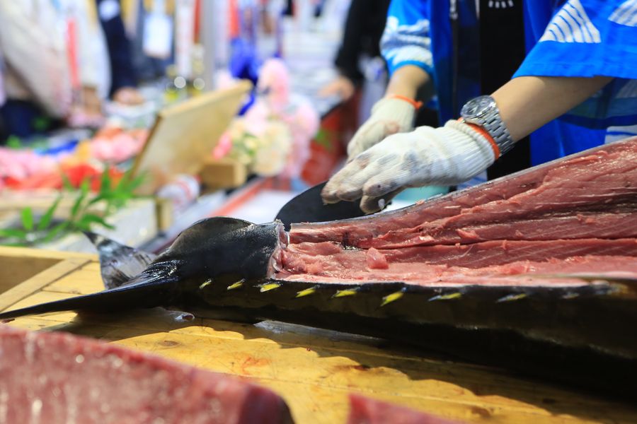 A staff member of Japan's Nagasaki Fishmarket Co., Ltd. disintegrates a bluefin tuna at the Food and Agricultural Products exhibition area during the second China International Import Expo (CIIE) in Shanghai, east China. (Xinhua/Sui Xiankai)