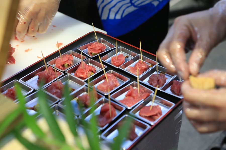 Staff members of Japan's Nagasaki Fishmarket Co., Ltd. prepare bluefin tuna meat for visitors at the Food and Agricultural Products exhibition area during the second China International Import Expo (CIIE) in Shanghai, east China. (Xinhua/Sui Xiankai)