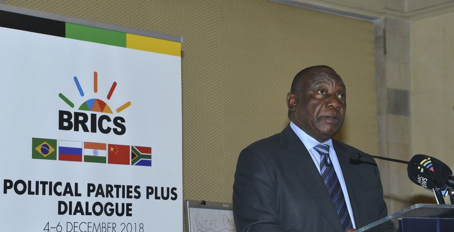 File photo shows South African President Cyril Ramaphosa delivering a speech during the BRICS political parties plus dialogue in Pretoria, South Africa, on Dec. 4, 2018. (Xinhua/Zhao Xi)