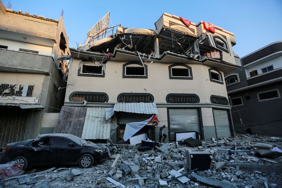 A Palestinian inspects the damaged house of Islamic Jihad leader Baha Abu al-Atta after an Israeli attack in Gaza City, Nov. 12, 2019. (Xinhua/Mohammed Dahman)