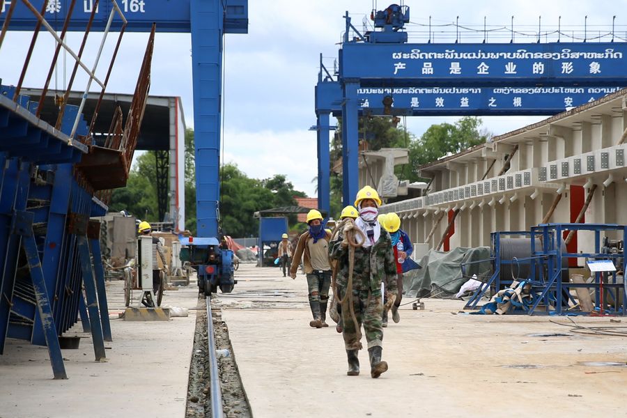 Lao workers at the China Railway No.2 Engineering Group (CREC-2)'s China-Laos railway beam fabrication yard in Laos on July 22, 2019. (Photo by Xiong Tianze/Xinhua)
