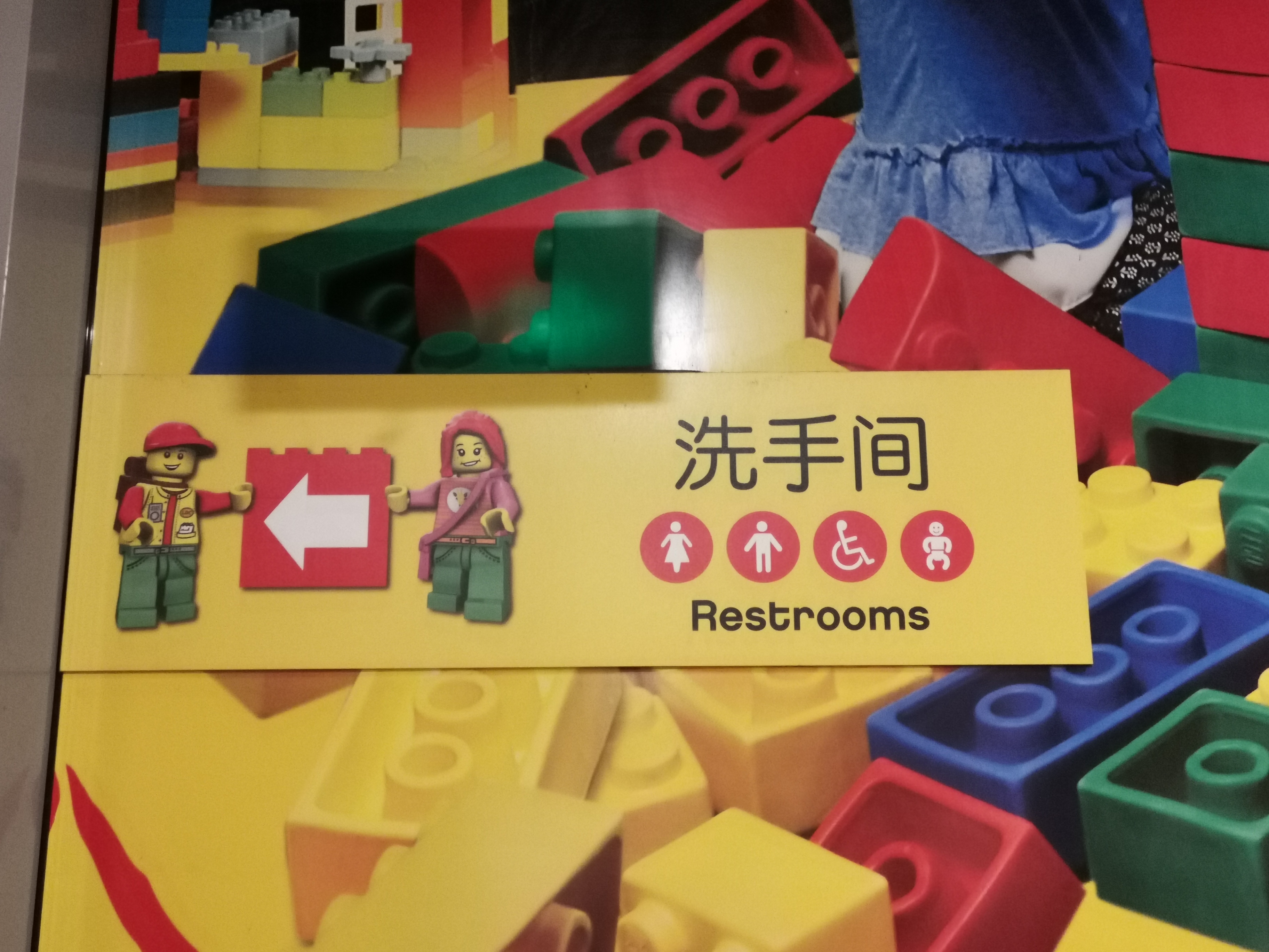 The sign outside the toilet of Shanghai's LEGOLAND Discovery Center on Nov. 16, 2019. (Xinhua/Hu Wenjia)