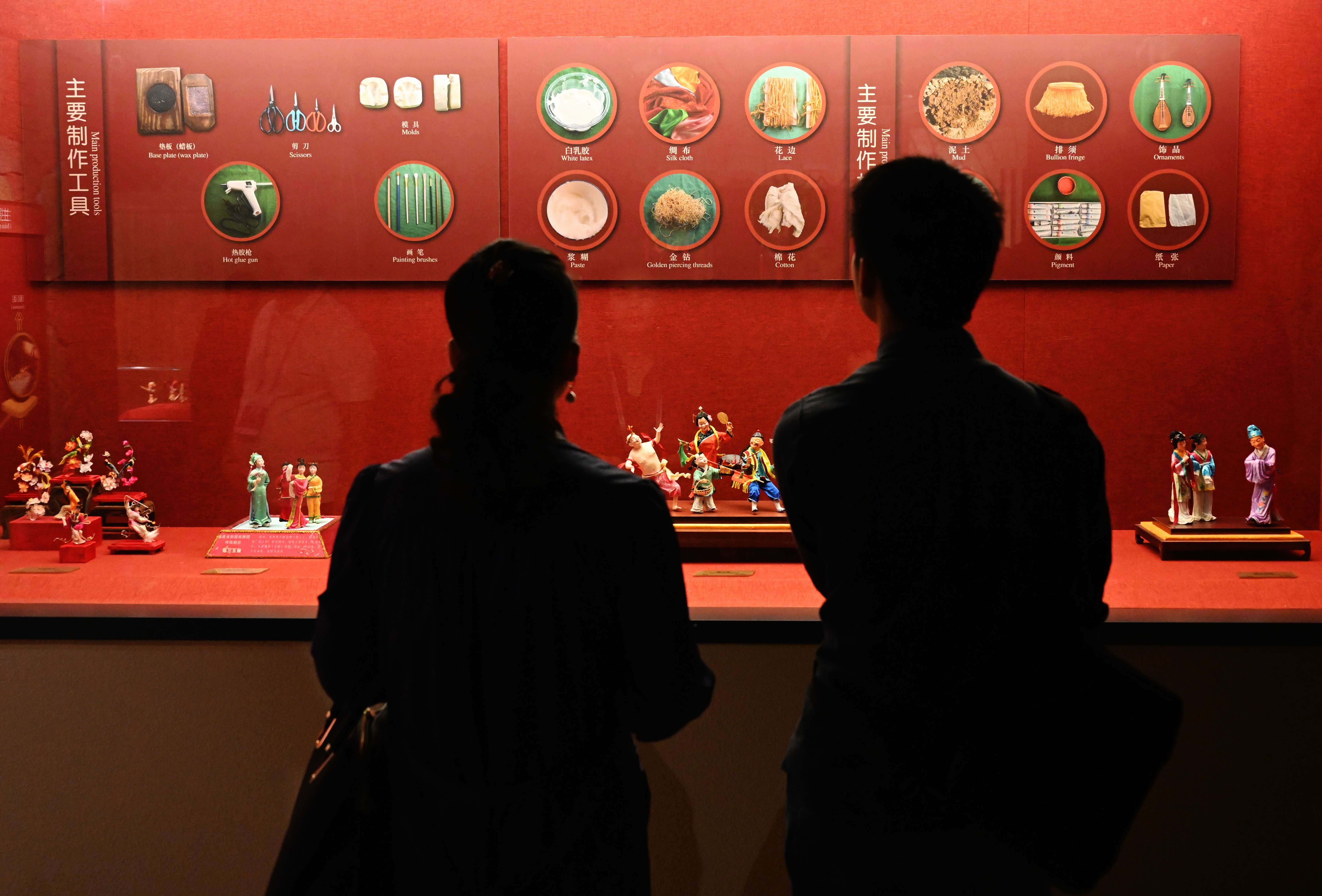 Two visitors view exhibits during an exhibition on intangible cultural heritages along the ancient Maritime Silk Road in Quanzhou, southeast China's Fujian Province, Nov. 23, 2019. (Xinhua/Wei Peiquan)
