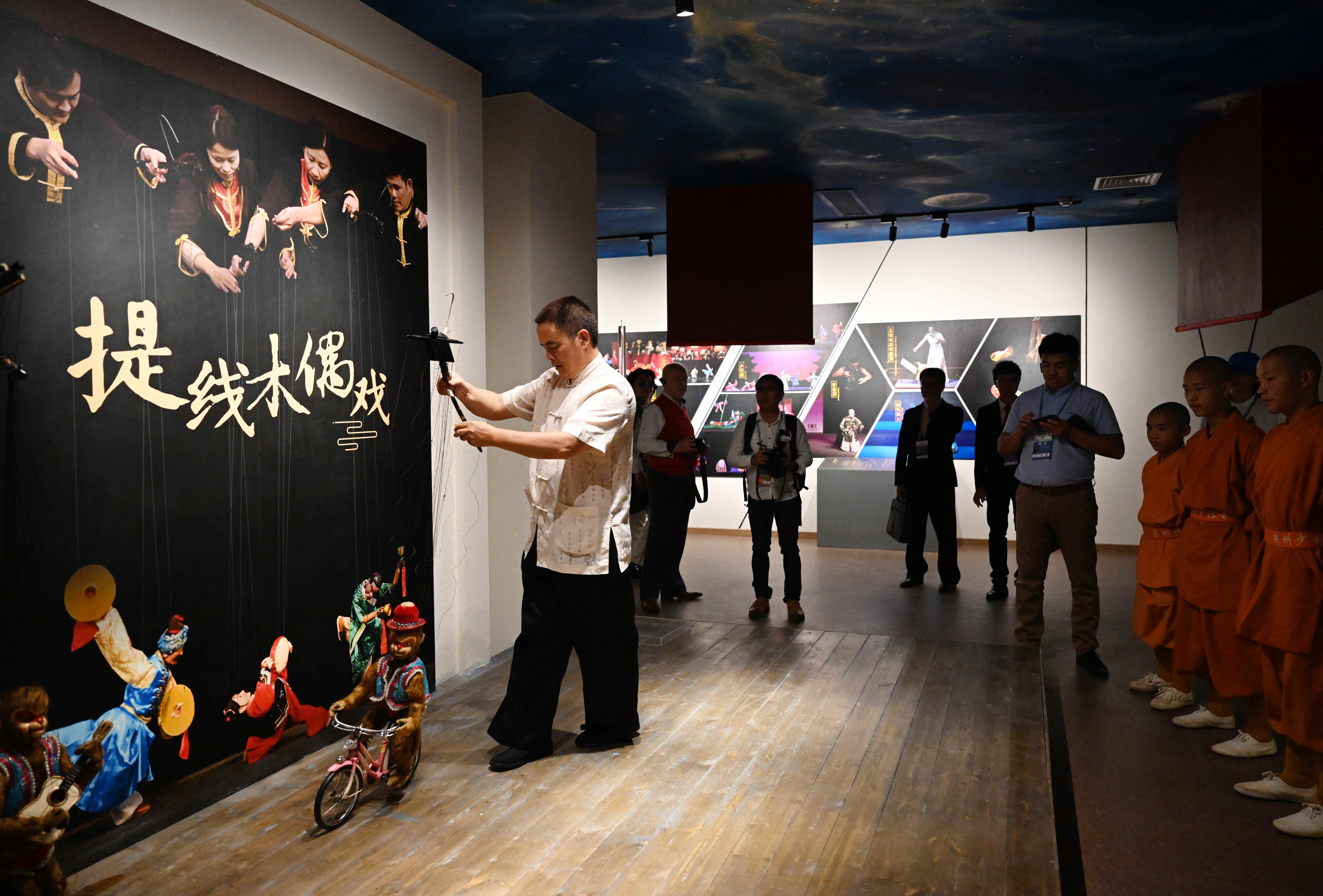 An artist manipulates a marionette in a performance for visitors during an exhibition on intangible cultural heritages along the ancient Maritime Silk Road in Quanzhou, southeast China's Fujian Province, Nov. 23, 2019. (Xinhua/Wei Peiquan)