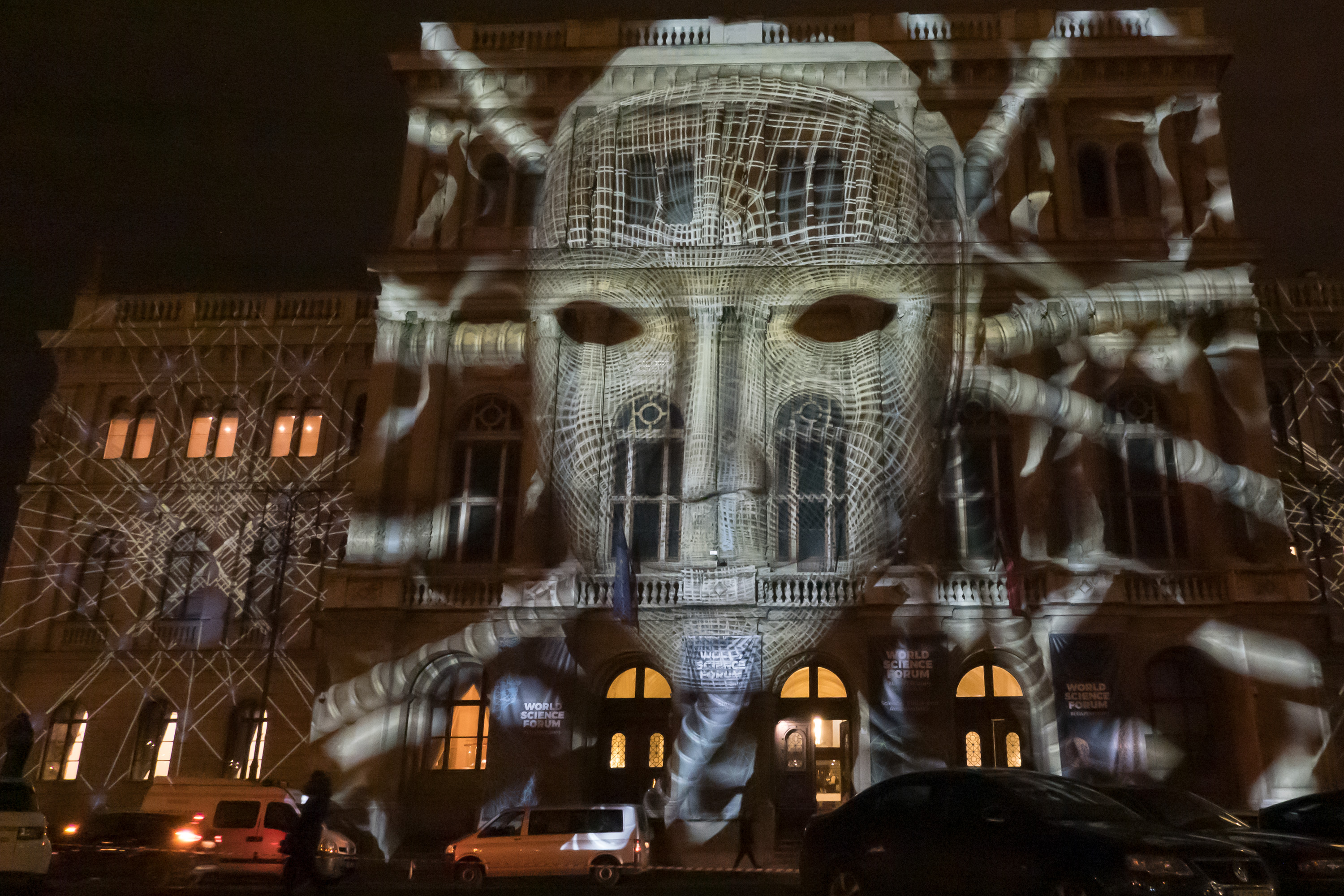 Light projection is shown on the facade of the Hungarian Science Academy as a side event of the World Science Forum in Budapest, Hungary. (Photo by Attila Volgyi/Xinhua)