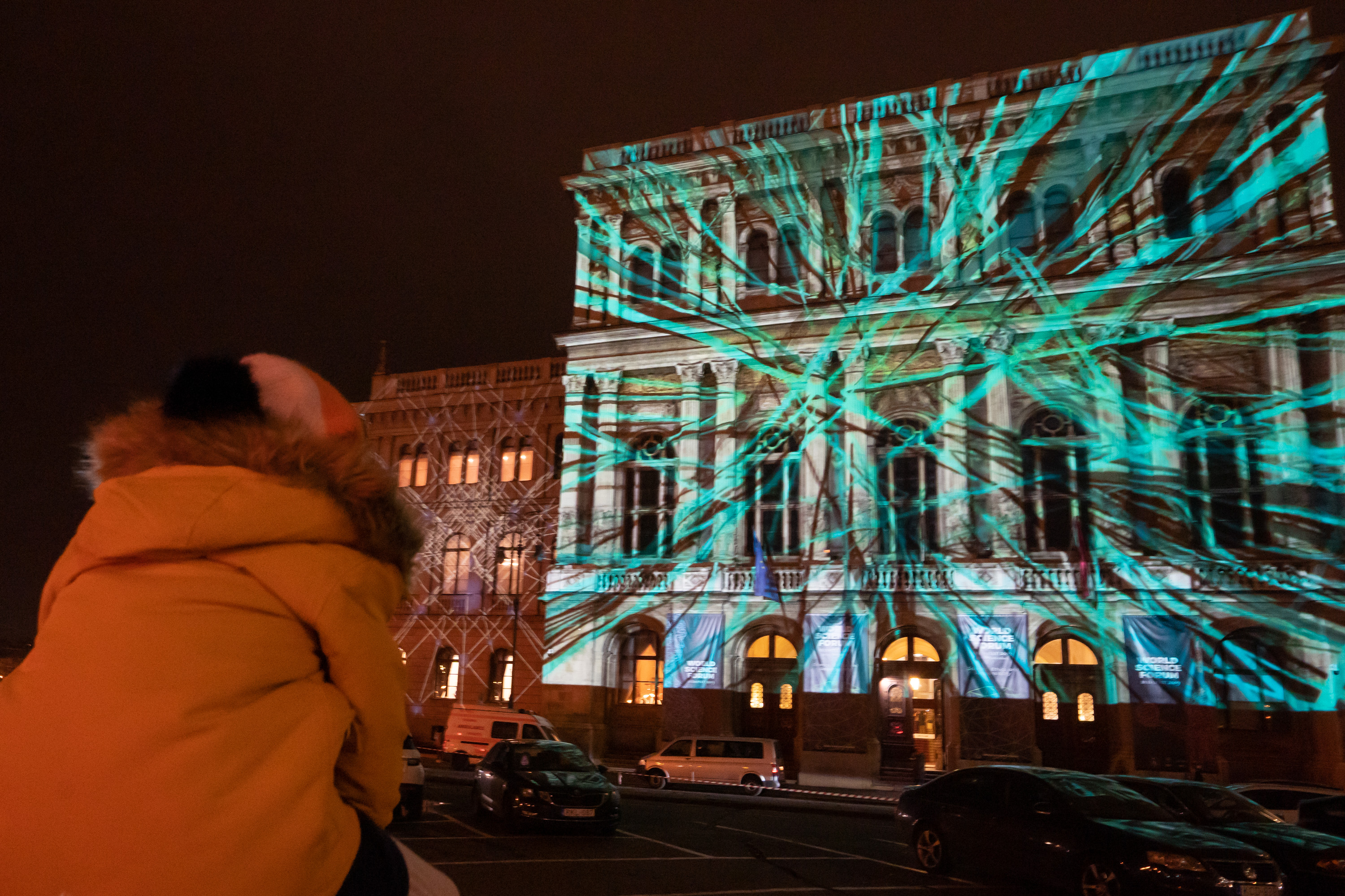 A viewer watches a light projection shown on the facade of the Hungarian Science Academy as a side event of the World Science Forum in Budapest, Hungary. (Photo by Attila Volgyi/Xinhua)
