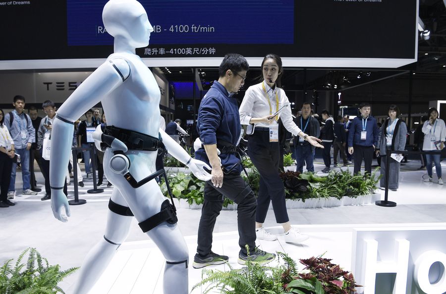 A visitor (C) experiences Honda Walking Assist device at the Automobile exhibition area during the second China International Import Expo (CIIE) in Shanghai, east China, Nov. 10, 2019. (Xinhua/Wang Peng)