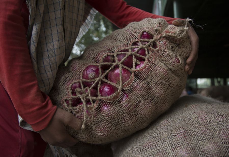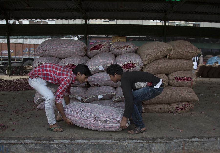 Workers pile up gunny bags filled with onions at a market in New Delhi, India, Nov. 8, 2019. (Photo by Javed Dar/Xinhua)