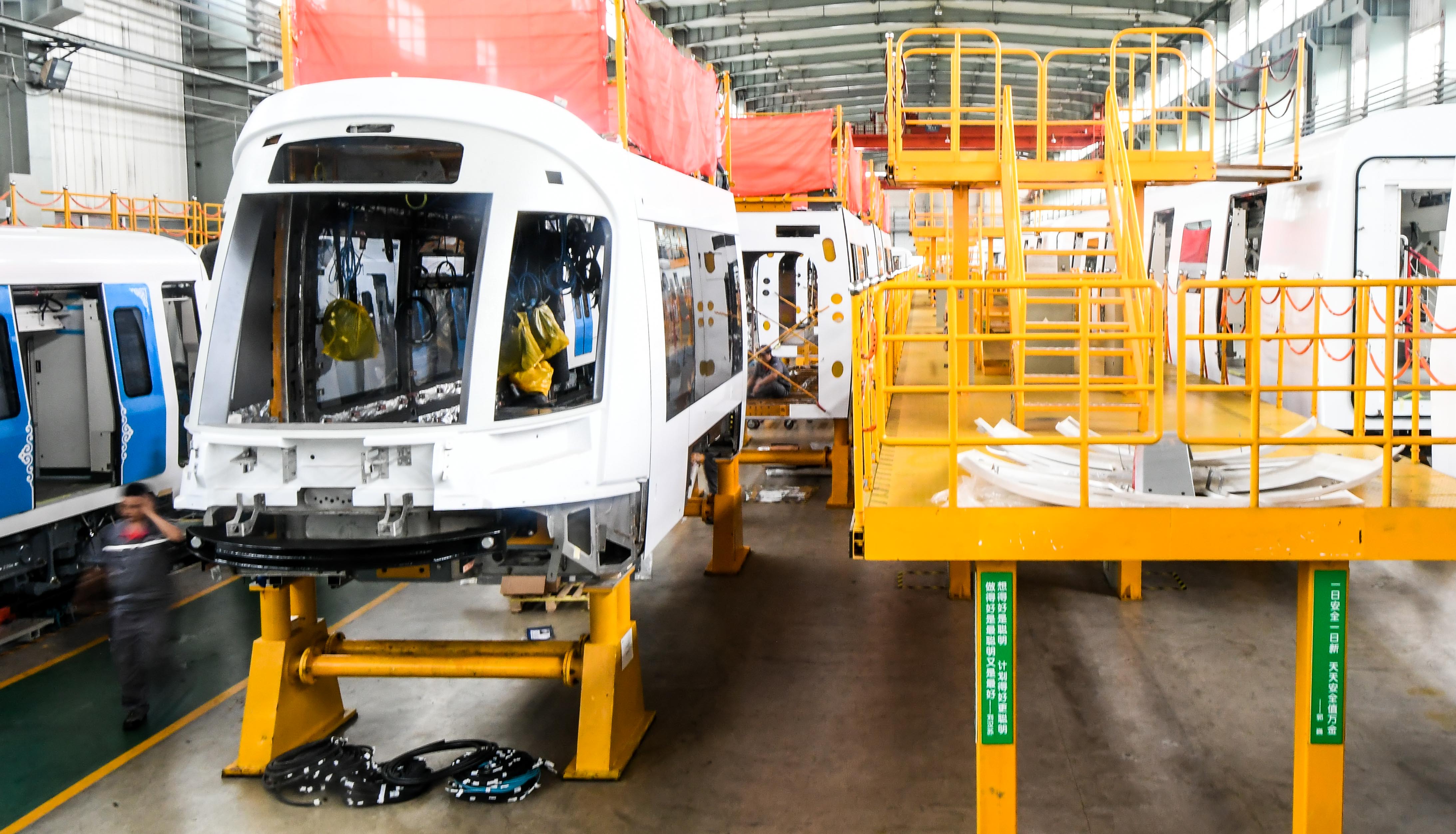 Photo taken on July 25, 2019 shows explosion-proof light rail trains being manufactured in CRRC Changchun Railway Vehicles Co., Ltd. in Changchun, capital of northeast China's Jilin Province. (Xinhua/Wang Haofei)