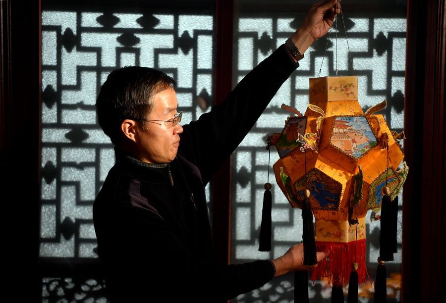 Zhang Juntao checks a lantern at a lantern museum of Bianjing Lantern Zhang set up by himself in Kaifeng City, central China's Henan Province, Nov. 27, 2019. (Xinhua/Li Jianan)