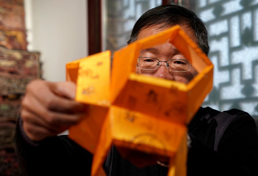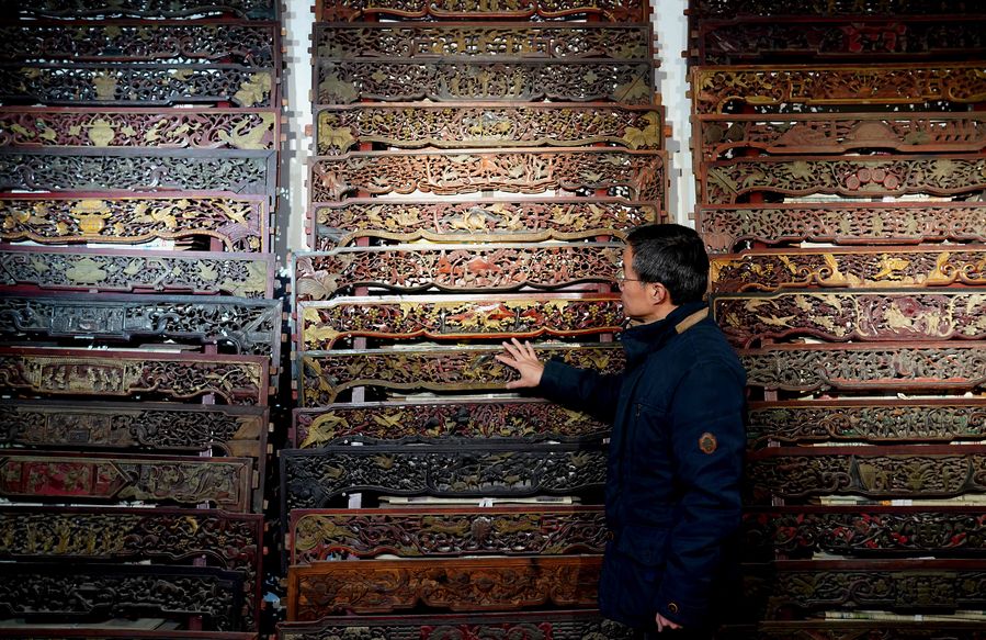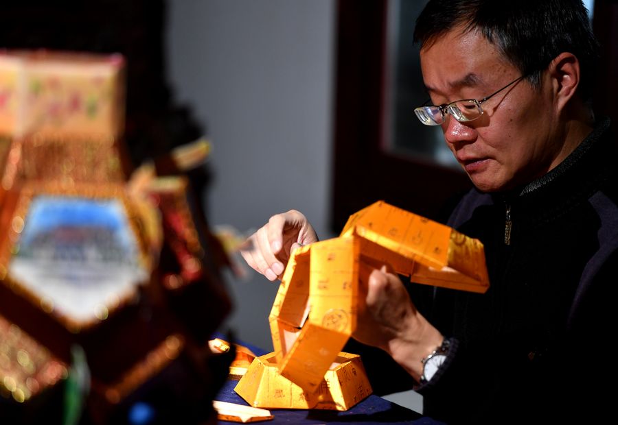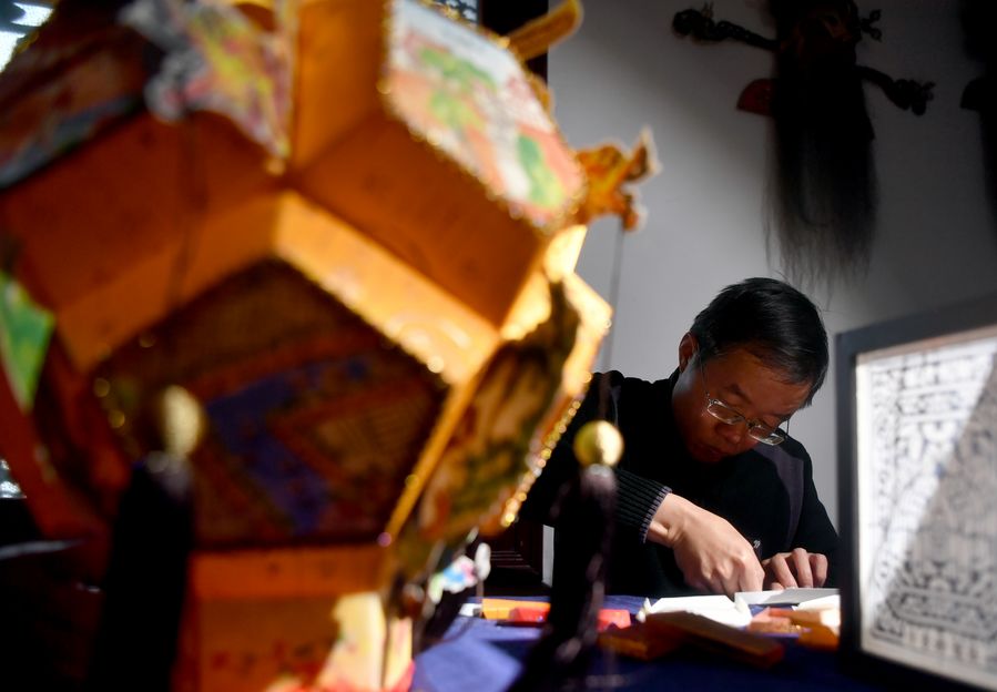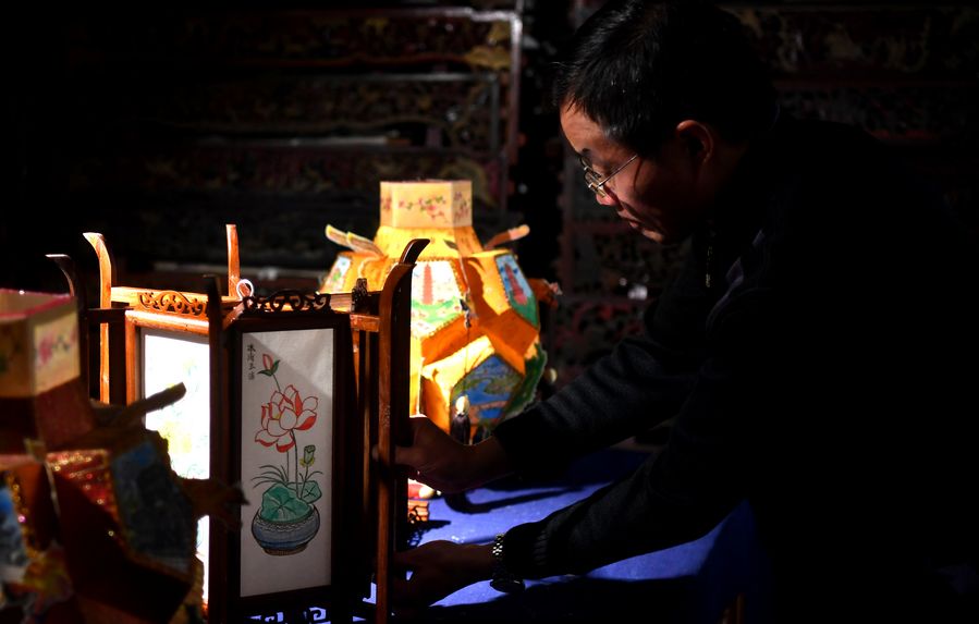 Zhang Juntao checks the traditional wood carving styles at a lantern museum of Bianjing Lantern Zhang set up by himself in Kaifeng City, central China's Henan Province, Nov. 27, 2019. (Xinhua/Li An)