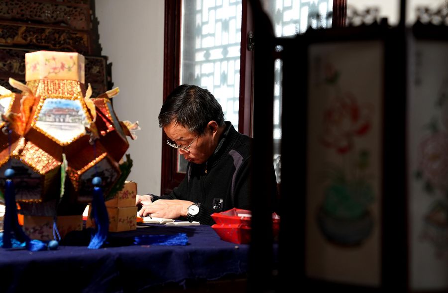 Zhang Juntao makes lanterns at a lantern museum of Bianjing Lantern Zhang set up by himself in Kaifeng City, central China's Henan Province, Nov. 27, 2019. (Xinhua/Li An)